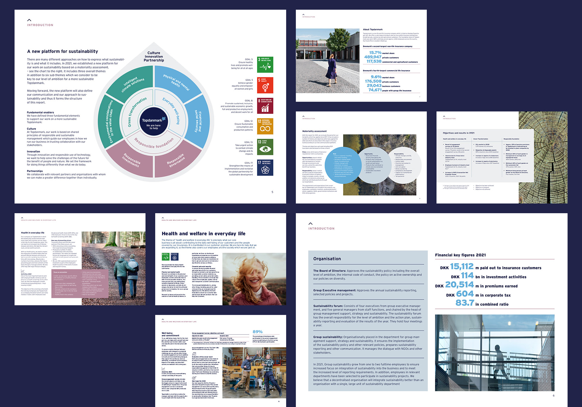 Corporate communications, corporate sustainability report design, conceptualization, typography hierarchy, icons, infographics, charts, and tables